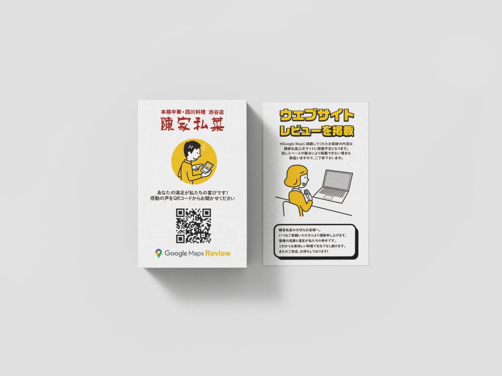 名刺サイズのショップカードを作成し、その表面にQRコードを配置することで、スキャンすると直接Googleのレビューページにアクセスできる仕組みを導入しました。この仕組みはシンプルですが、内包されているメッセージには細心の注意を払っています。