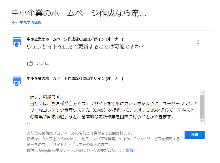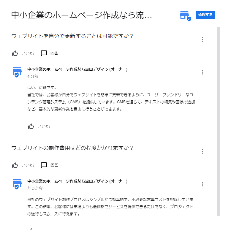 GoogleビジネスプロフィールにおけるQ&Aセクションは、顧客がビジネスに関する質問を投稿し、ビジネスオーナーや他のユーザーが回答するスペースです。しかし、ビジネスオーナー自身が質問を投稿し、それに答えることで、よりコントロールされた情報提供が可能になります。