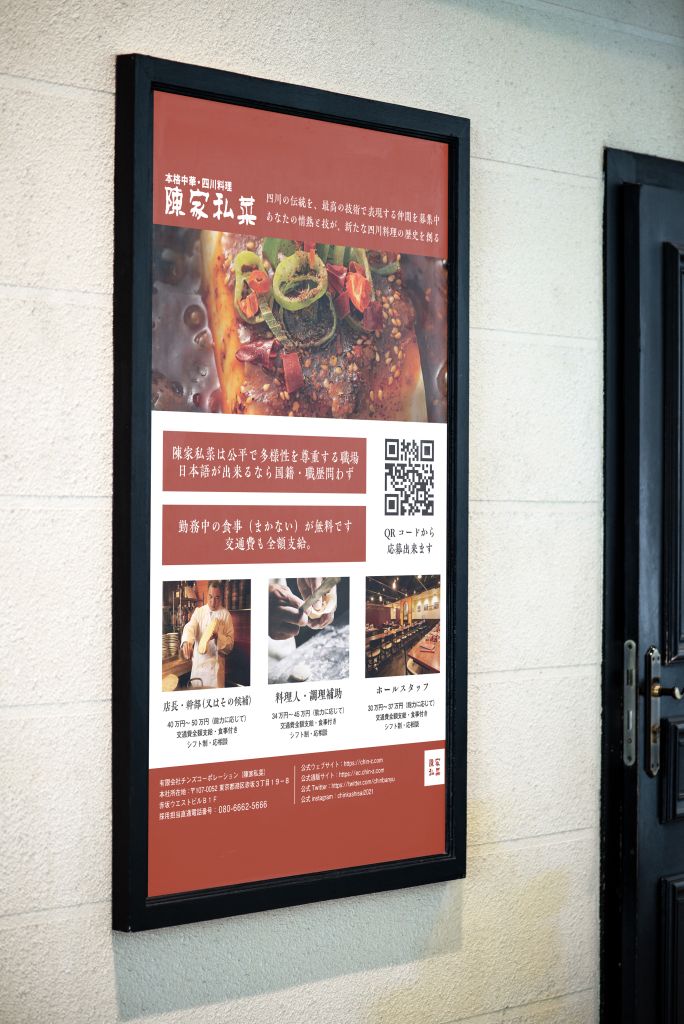 このポスターは、お店の内部掲示用はもちろん、地元の駅や街中の広告スペースに配布することを想定しています。求人募集という即時的な行動を促す目的に加えて、長期にわたり陳家私菜のブランドイメージを高める要素も考慮に入れています。