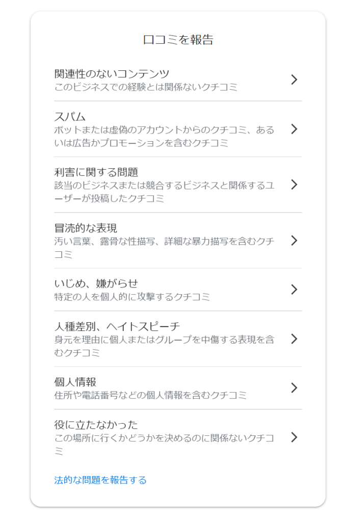 「報告」をクリックすることで、これらの内容が不適切であることを伝えられます。1つの口コミに対して複数回報告することが可能ですので、該当するすべての理由で報告を行いましょう。