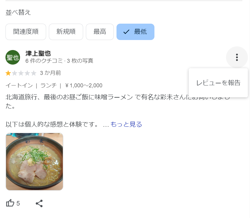 管理者のアカウントから報告するのはもちろんのこと、知り合いや友人のGoogleアカウントからも報告を行うと、削除される可能性がさらに高まります。通常時はこの報告で削除されることはほとんどありませんが、炎上時には、炎上中についた口コミ以外の過去の悪い口コミも削除されることがあります。是非試してみてください。